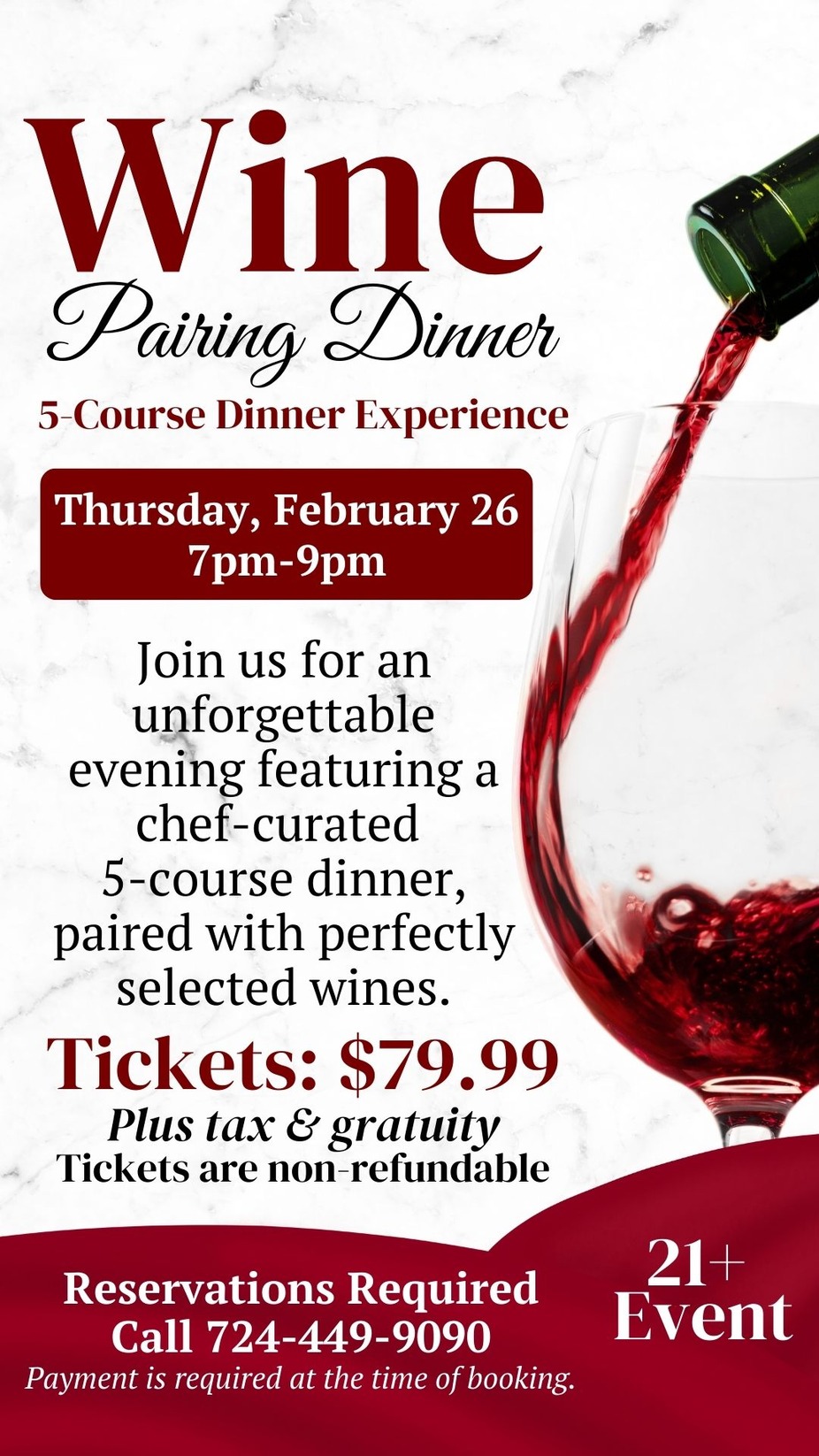 Join us for an elevated night out at our 5-Course Wine Pairing Dinner on Thursday, February 26 from 7pm-9pm. Enjoy a chef-curated five-course dining experience, with each course paired with a complimentary wine selection to perfectly match the flavors of the evening.
